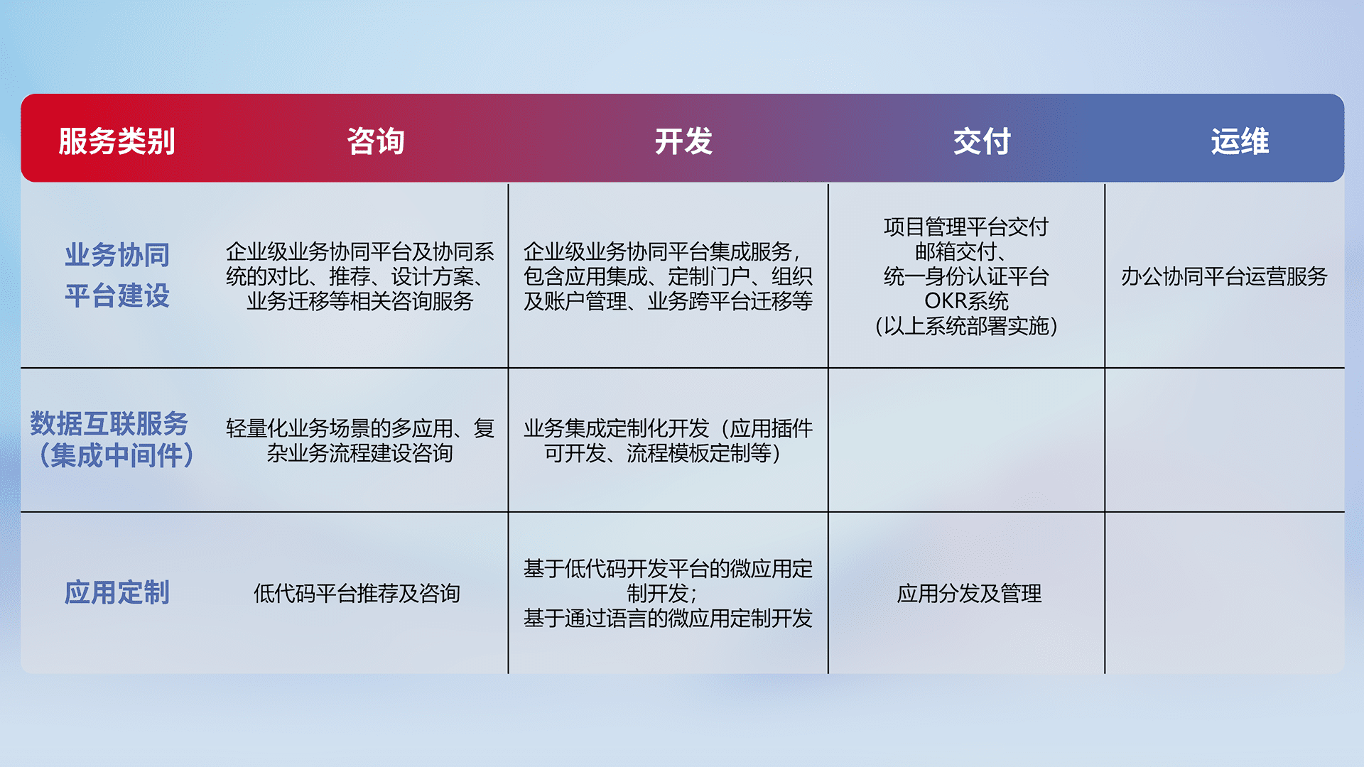 针对钉钉、、企微、、、IDaas等平台级产品提供产品的规划、、方案、、、交付、、、、定制化开发等服务,,,实现如统一协同办公、、、智能客户服务、、、混合会议管理、、、智能数据查询、、等业务场景,,实现数字化转型。。。。